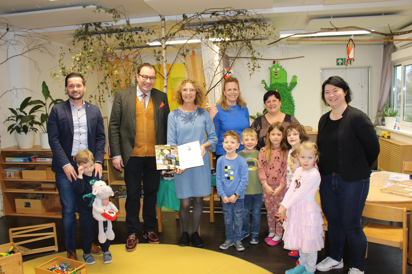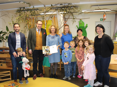 Im Bild von links nach rechts: Hauptamtsleiter Andreas Müller, 1. Bürgermeister Dr. Bernhard Resch, Monika Bernhardt, Kindergartenleiterin Nina Rabe, Erzieherin Diana Speigl, die Personalratsvorsitzende Melanie Schlauderer und Kinder der Zwergerlgruppe.