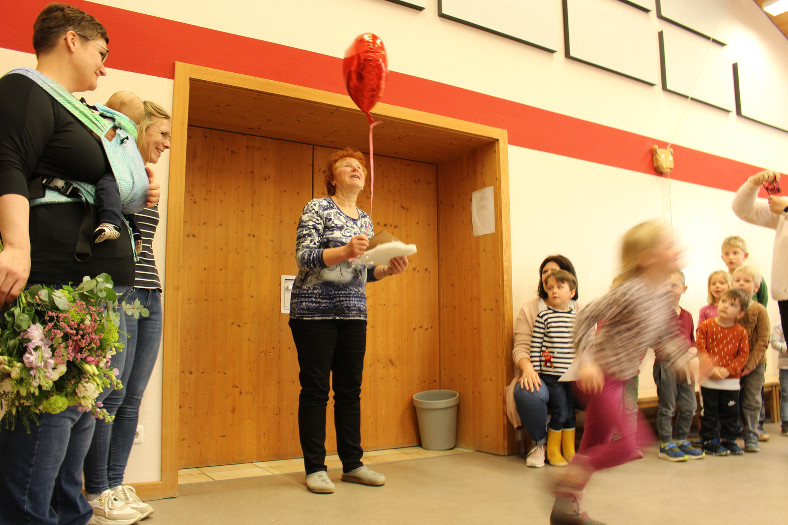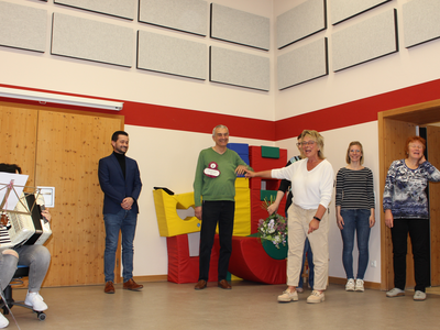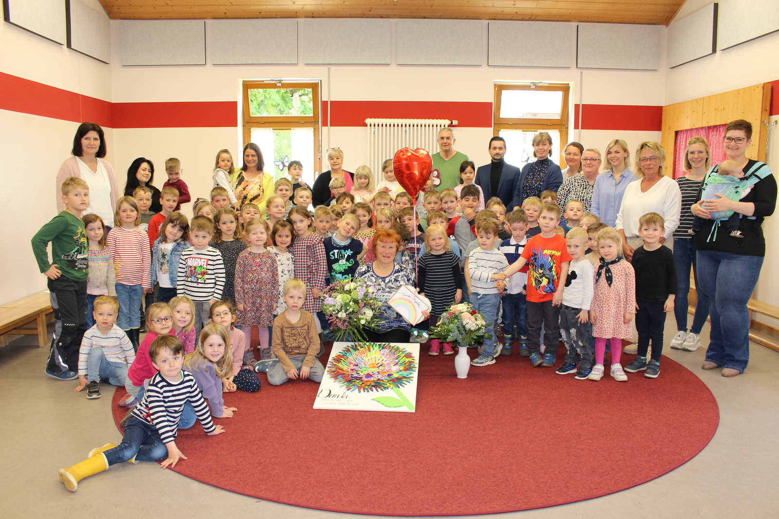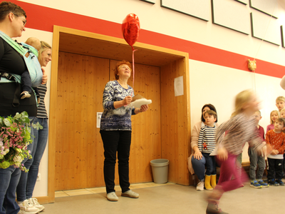 Die gelobte Kinderpflegerin zeigte sich recht erstaunt: „Wie habt ihr das gemacht, ich hab gar nichts mitbekommen.“ Alle Kinder, ihre Kolleginnen und die Vertreter der Stadt Abensberg waren in der Turnhalle versammelt, um sie zu überraschen – und manches Geschenk zu überreichen. Auch vom Elternbeirat: Cornelia Amberg und Corina Marré überreichten ein schmuckvolles Präsent und dankten herzlich für ihren Einsatz um die Kinder. Und die, die Kinder, sangen ihrer Frau Zinner ein Ständchen und brachten Geschenke, die sie heimlich in ihren Gruppen gebastelt hatten.
