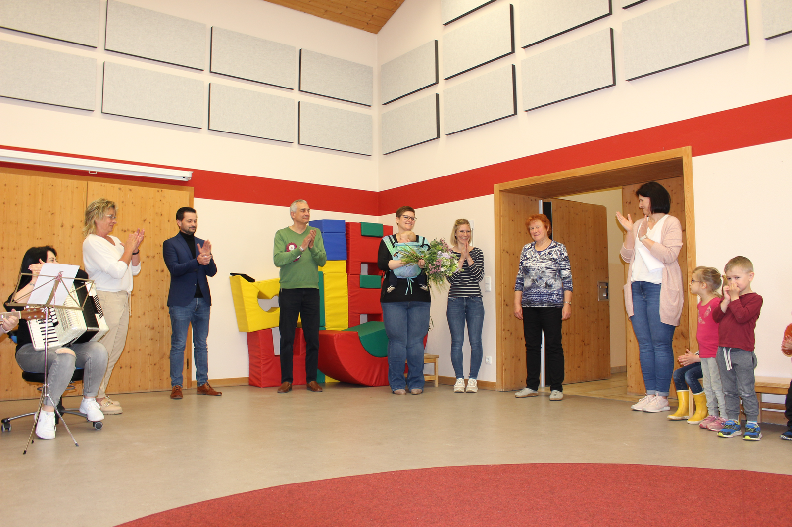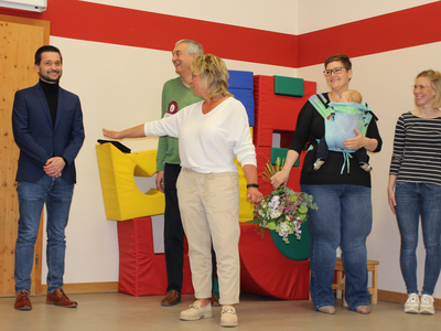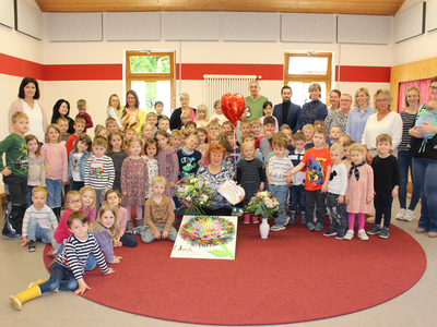 Im Bild oben Angelika Zinner in der Mitte. Ganz rechts die beiden Elternbeirätinnen Cornelia Amberg und Corina Marré, daneben Kindergartenleiterin Birgit Firth. Mittig oben Hauptamtsleiter Andreas Müller, links neben ihm Personalleiter und Fridolins Nachbar, Franz Piendl.