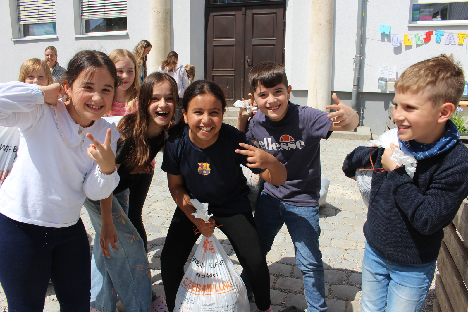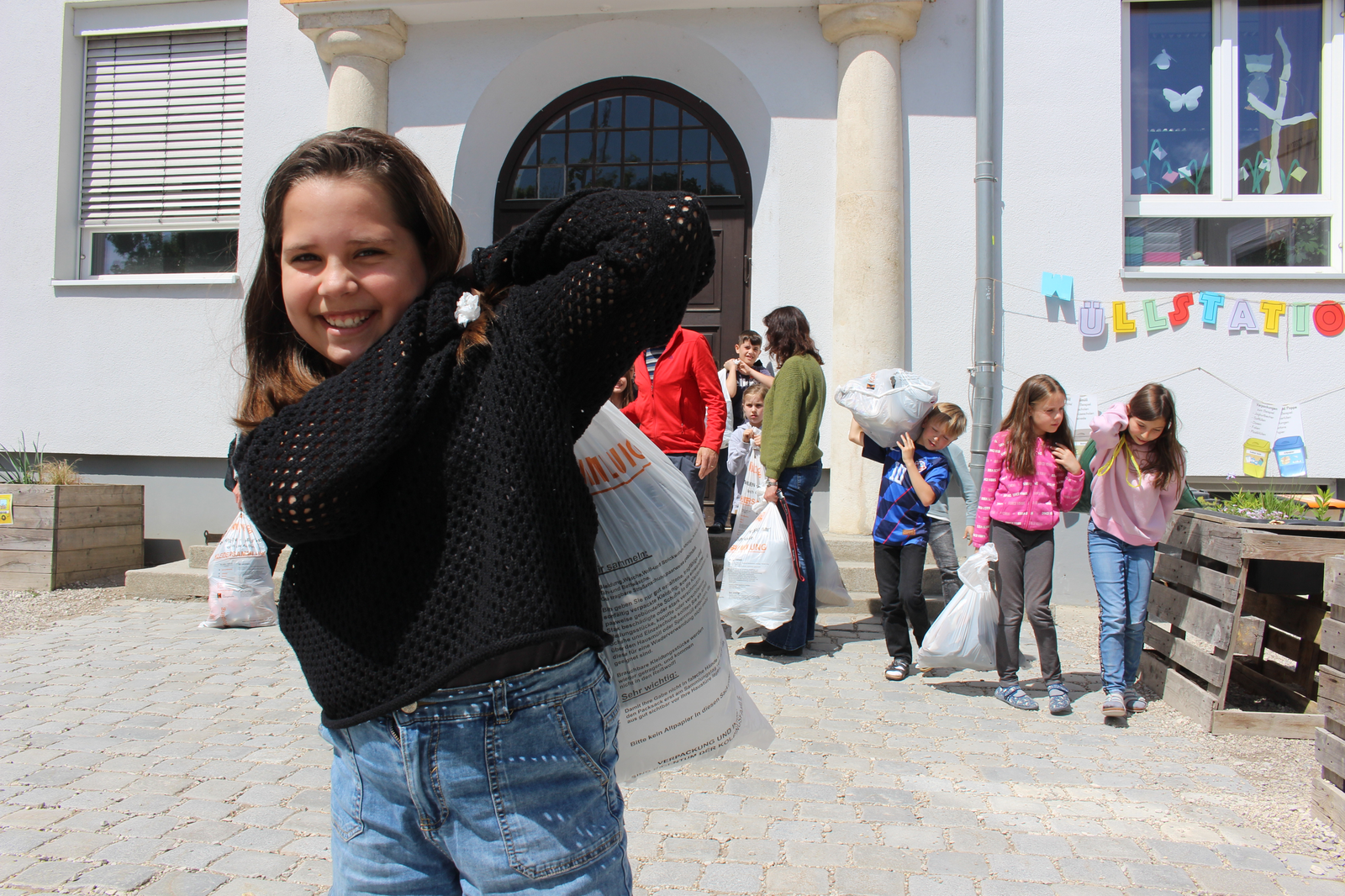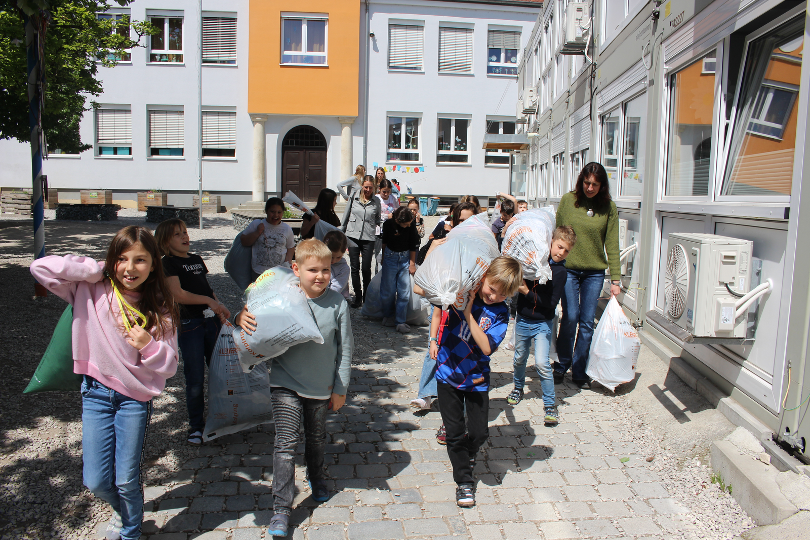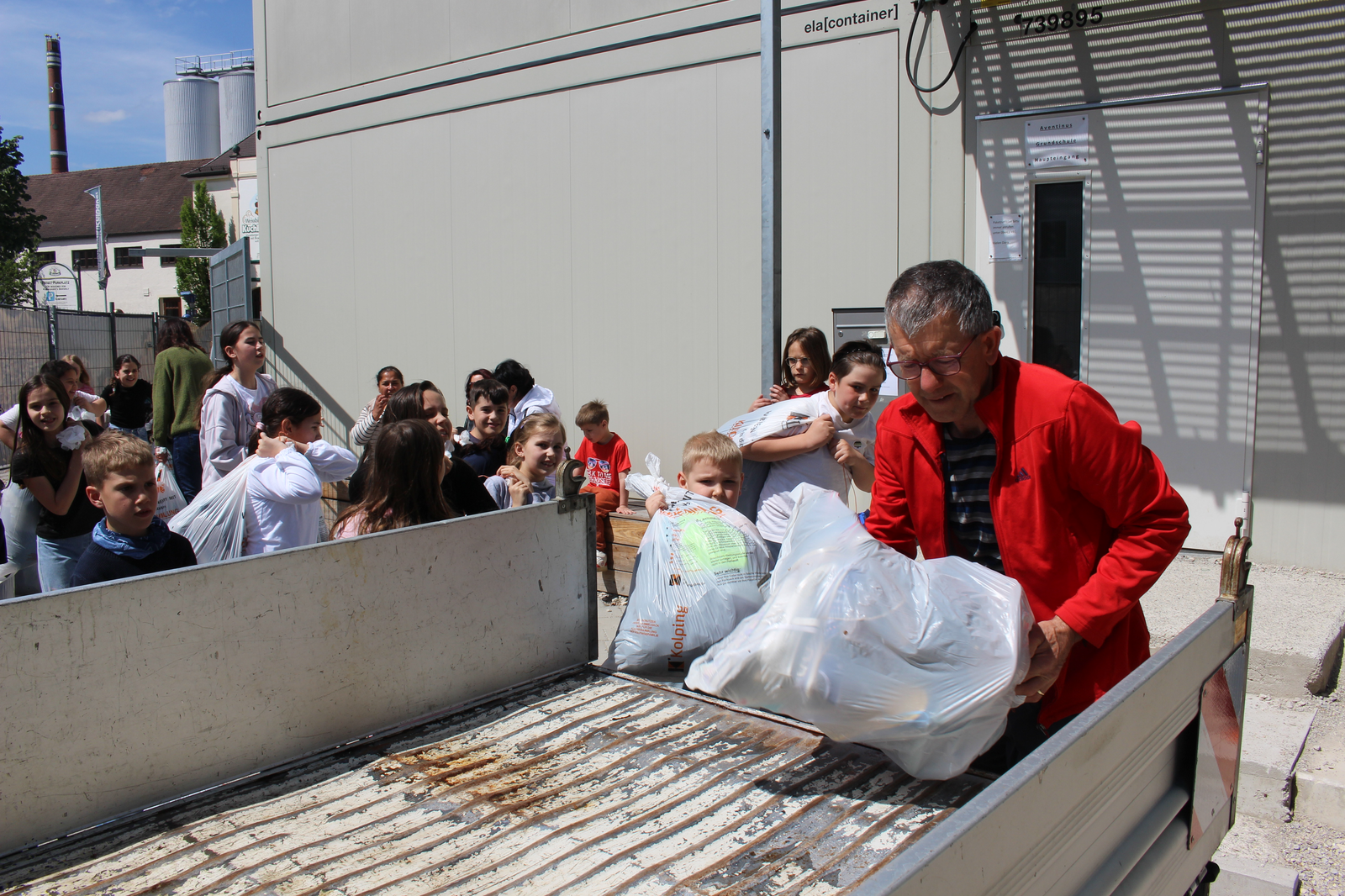 Im Bild oben in der Mitte Konrad Listl von Kolping, rechts Anneke Sinzinger, Lehrerin der 3b (die Schülerinnen und Schüler sind mit im Bild) und zuständig für die vielen Aktivitäten, die eine „Umweltschule“ ausmachen. Links im Bild vorne Barbara Schmal vom Elternbeirat und hinter ihr Rektorin Andrea Brandl. In der Galerie Schnappschüsse vom Verladen mit den - gut aufgelegten! - Kindern. Nochmals das Hauptmotiv. Fotos: Knott