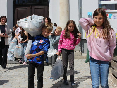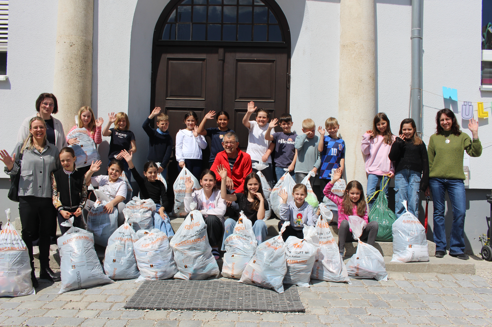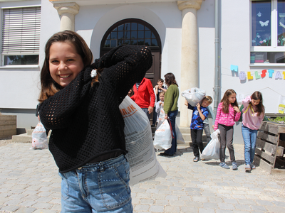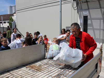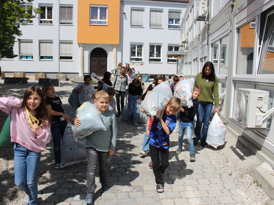 Die Kinder waren mit Eifer dabei, suchten zuhause Schuhe, die nicht mehr benötigt werden, und brachten sie in ihr Schulhaus in der Römerstraße. Zehn Säcke voller guter Schuhe kamen zusammen, die von den Umweltsprechern – in jeder Klasse gibt es zwei, die wie Klassensprecher gewählt werden - sortiert und gebündelt wurden, dazu 15 weitere Säcke mit sehr gut erhaltener Kleidung. Am Freitagmittag vor der Altkleidersammlung haben die Kinder der 3b und ihre Lehrerin Anneke Sinzinger dann auch beim Verladen der Säcke geholfen; dafür kam Konrad Listl von der Kolpingsfamilie mit einem vom Bauhof der Stadt geliehenen kleinen Transporter zur Schule. Frau Sinzinger ist für die vielen Aktivitäten, die eine „Umweltschule“ ausmachen, verantwortlich.