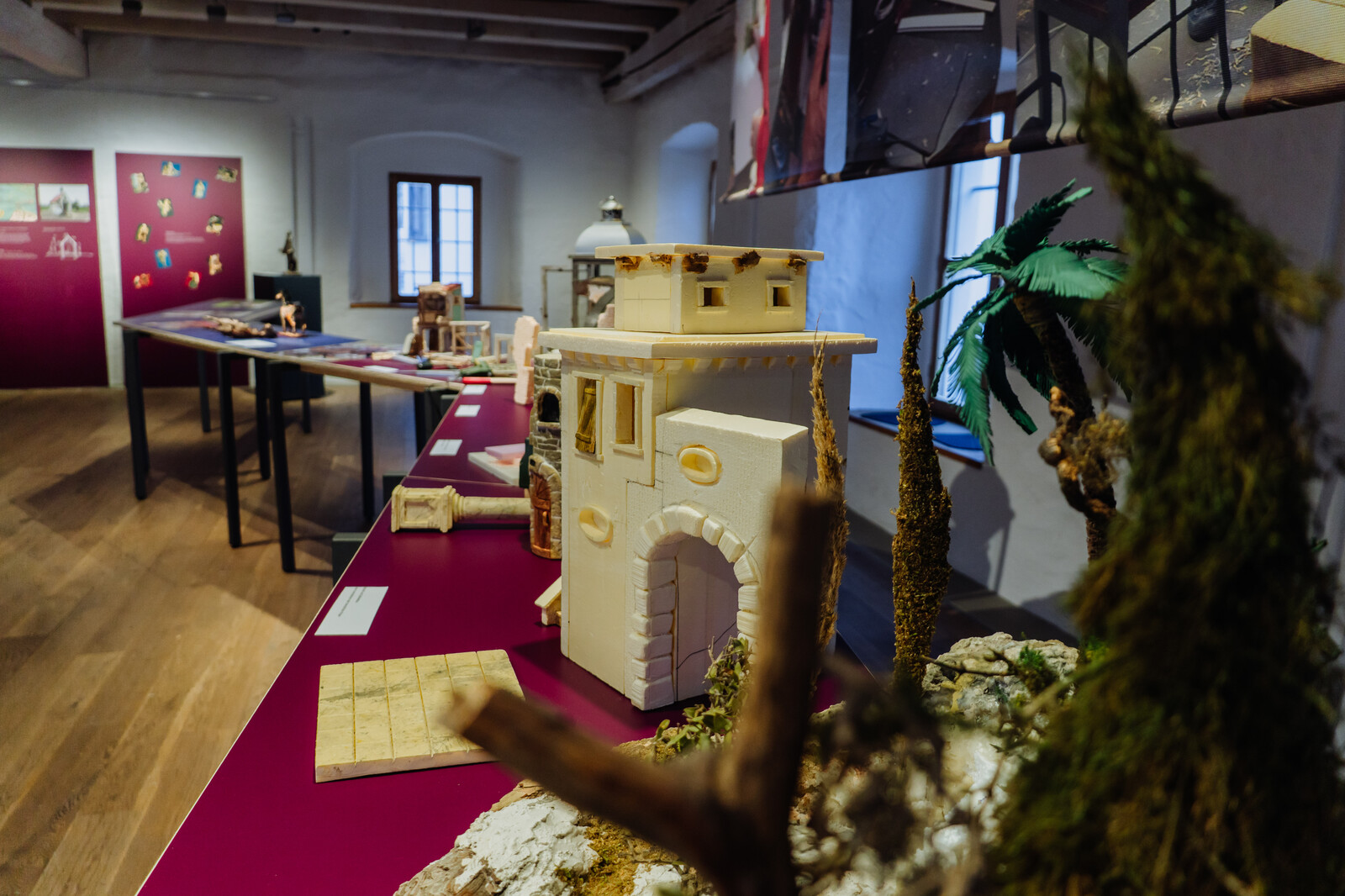 „Die Krippen von Abensberg“ – ein klangvoller Titel, der eine glanzvolle Ausstellung erwarten lässt. Und glanzvoll ist die Ausstellung, die aktuell und noch bis zum 1. Februar 2026 im Stadtmuseum im Herzogskasten zu sehen ist. Sie zeigt mehr als Krippen: In Ergänzung zu der jährlich stattfindenden Krippenausstellung im Kreuzgang ermöglicht diese Ausstellung zum Beispiel einen Blick hinter die Kulissen. Wer noch nicht an einem der Krippenbaukurse des Krippen- und Kapellenvereins teilgenommen hat, kann in der nachgestellten Werkstatt erfahren, aus welchen Materialien und mit welchen Werkzeugen diese gefertigt werden. Die Krippenbauer, unter Anleitung von Krippenbaumeister Johann Spitzer, haben dafür so allerlei aus ihrer Werkstatt in Sandharlanden in den Herzogskasten gebraucht, was sicherlich nicht alltäglich ist – wie den Querschnitt einer Fasskrippe oder den Aufbau einer Laternenkrippe.