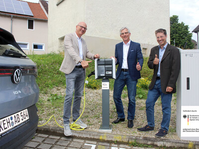 Im Hauptmotiv oben von links Abensbergs 1. Bürgermeister Dr. Uwe Brandl, Dr. Frank-Holger Dietzel und Dr. Rainer Reschmeier an den neuen E-Ladesäulen in der Aunkofener Straße auf Höhe der Hausnummer 15. Nochmals in der Galerie.