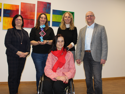 Im Bild oben von links Brigitte Schönhofer-Bohrer, Katrin Bopp mit der Auszeichnung, Liane Köppl, Michael Kugler und vorne Marion Huber-Schallner.