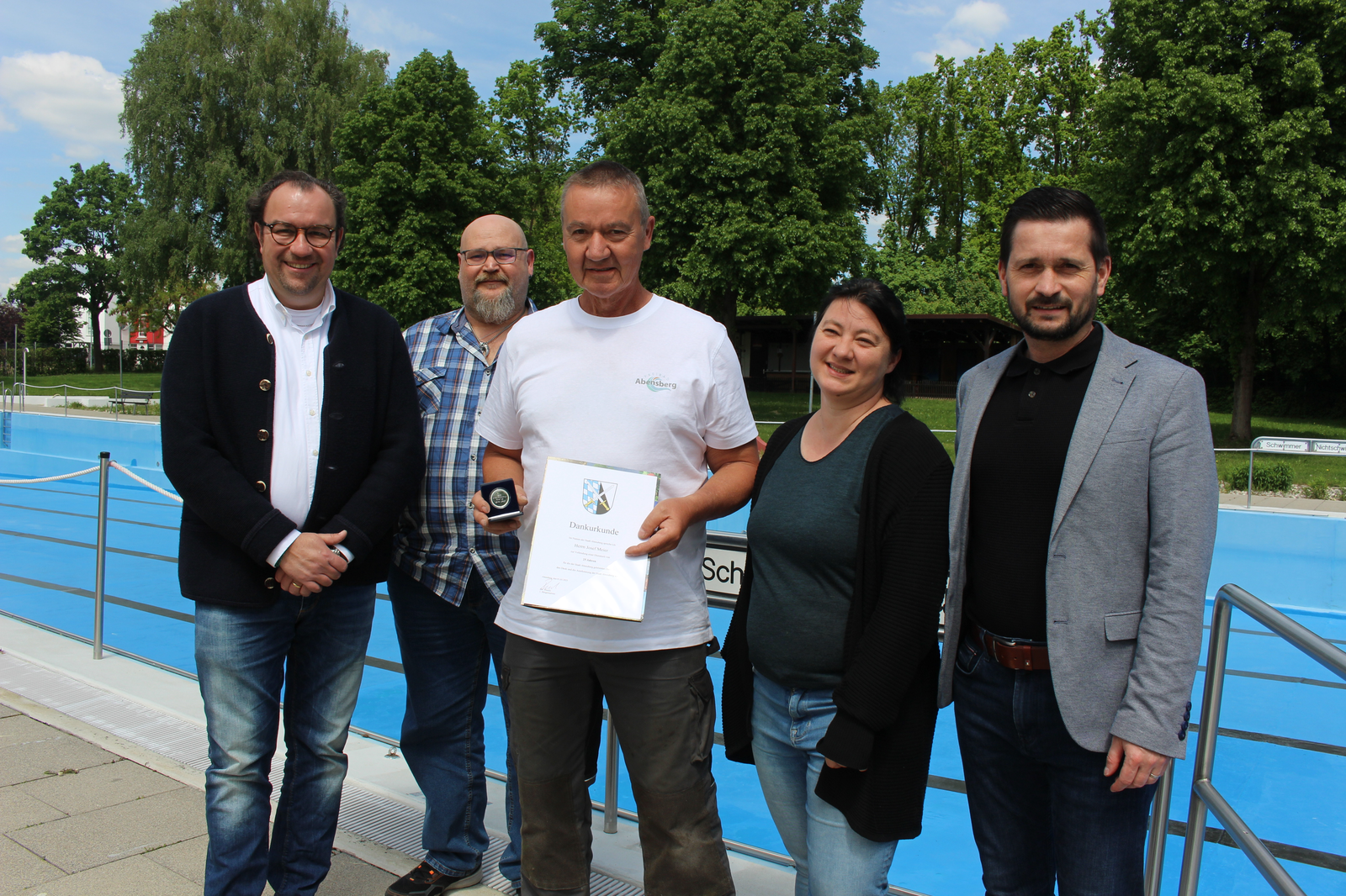 Die Stadt Abensberg hat Herrn Josef Meier zu seiner nunmehr 25-jährigen Tätigkeit im öffentlichen Dienst herzlich gedankt. 1. Bürgermeister Dr. Bernhard Resch überreichte ihm die Dankurkunde der Stadt Abensberg, Hauptamtsleiter Andreas Müller brachte eine Gedenkmünze mit. Viel Zeit blieb nicht – die Freibadsaison Abensberg startet am Samstag, 17. Mai, da ist viel zu tun.