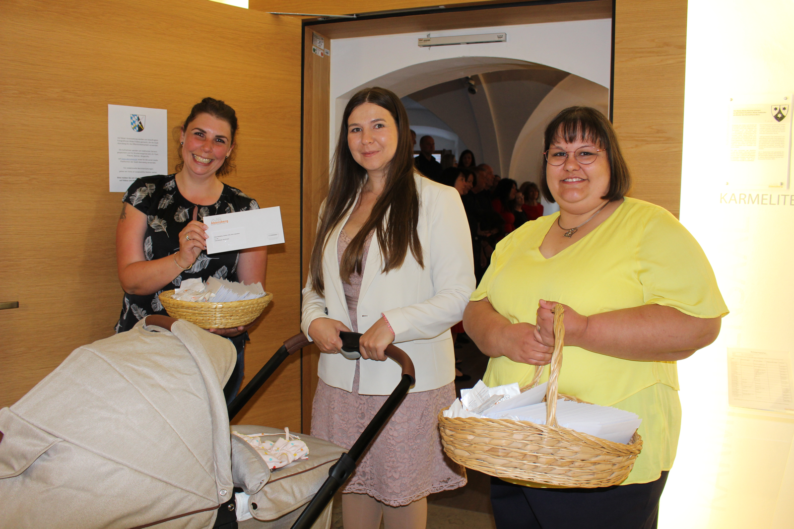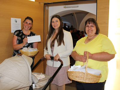 Im Foto oben: Carina Junker (li.) und Mariele Bindl (re.) überreichten Begrüßungs-Präsente - hier an Natalja mit Antonia im Kinderwagen, Papa war noch im Saal. In der Galerie Schnappschüsse vom Abend und nochmals das Hauptmotiv.